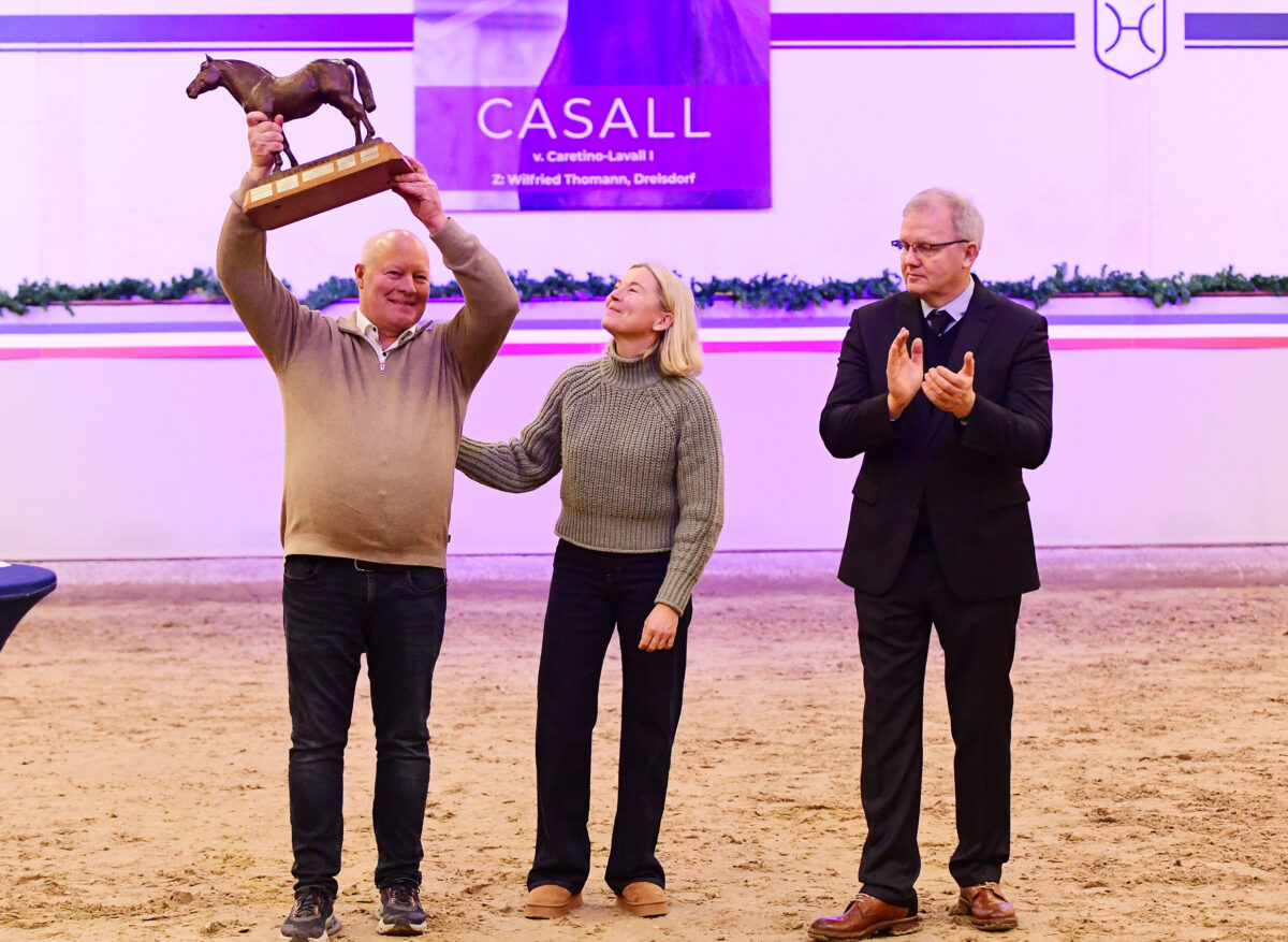 Züchter des Jahres 2025, Timm Peters, mit seiner Frau Nicole Peters und dem Ersten Vorsitzenden des Holsteiner Verbandes, Olaf Rörden Foto: Janne Bugtrup