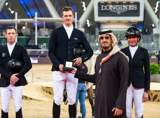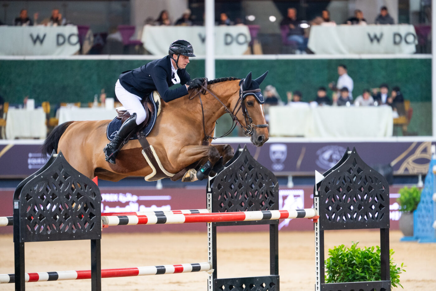 Im Dezember waren die beiden schon dicht dran an einem 5*-Sieg: Heute hat es für Christopher Kläsener und Popeye vd Bisschop für das oberste Treppchen auf dem Podium gereicht. Und das war schon eine kleine Sensation. Im mit 106.000 Euro dotierten CSI5* Hauptspringen in Doha über 1,55m setzte die Nummer 588 der Weltrangliste die internationale Konkurrenz mit einer Zeit von 35.92 Sekunden im Stechen derart unter Druck, dass es nicht mal der Nummer 2 der Welt, Scott Brash, gelang, ihn einzuholen. Dabei nahm der Schotte als vorletzter Starter im Sattel von Hello Chadora Lady (v. Chacco-Blue) den Kampf durchaus auf und war mit einer Zeit von 36.53 Sekunden auch dicht dran. Aber am Ende musste er mit Platz zwei Vorlieb nehmen und bei der Siegerehrung erklang die deutsche Nationalhymne.