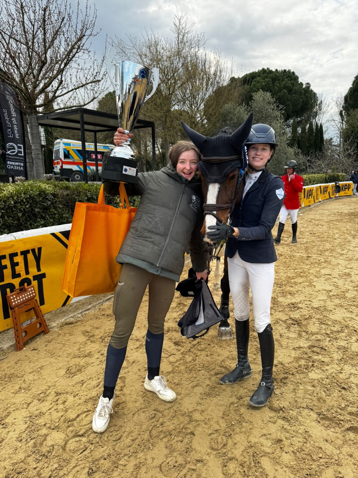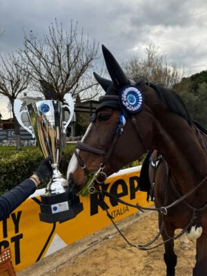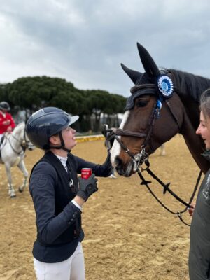 Als erstes und noch bevor es den großen silbernen Pokal gab, war das dankbare Küsschen für den vierbeinigen Partner fällig: Johanna Beckmann ist mit ihrer Emelie van de Mirania Stam (v. Emerald) im Stechen Zweite im 1,50m Grand Prix der Toscana Tour in Arezzo geworden. Nur neun Hundertstel fehlten am Ende auf den Heimsieger Paolo Paini mit Casal Dorato (v. Casalito). Doppelnull waren sie natürlich beide in dem herausfordernden Parcours, den nur neun der 59 Starter fehlerfrei im Umlauf absolviert hatten