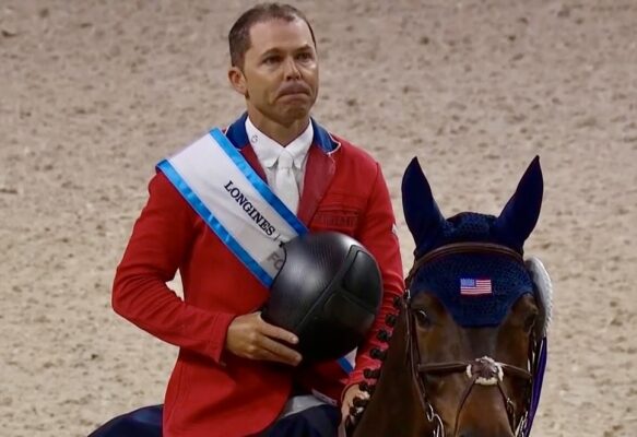 Einen starkes Ausrufezeichen setzte Daniel Deusser in der ersten Runde beim Weltcup-Finale in Fort Worth, einem Zeitspringen über 1,60m: Mit Otello de Guldenboom, dem Sohn seines Erfolgspartners Tobago Z, erwischte der Weltcup-Sieger von 2014 eine super flüssige Runde mit einer fehlerfreien Top-Zeit von 62.21 Sekunden. Nur einer war schneller an diesem Nachmittag in Texas: Die Nummer zwei der aktuellen Weltrangliste, Kent Farrington. Im Sattel von Toulayna (v. Toulon) ritt er auf Angriff und sprintete nach nur 62.03 Sekunden ins Ziel. Das war die Führung, der er nicht mehr aus der Hand gab. Platz drei sicherte sich der dreifache Weltcup-Sieger Steve Guerdat mit Albführen’s Iashin Sitte (v. Bamako de Muze) und einer Zeit von 62.49 Sekunden vor Lillie Keenan mit Kick On (v. Warrior).