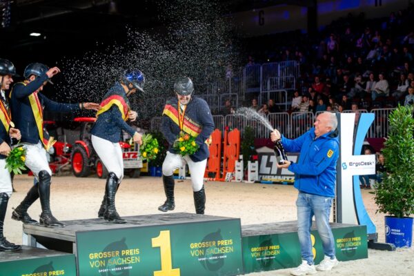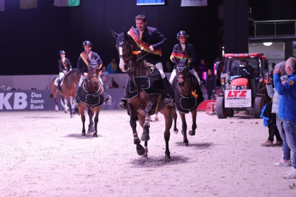 In der Halle herrschte eine tolle Stimmung. Über 2.700 Besucher jubelten mit und feuerten ihren Landesverband an. Ein anspruchsvoller Parcours mit vielen Distanzen forderte die Reiter-Pferd-Paare heraus. Erst Toni Haßmann als vierter Starter lieferte die erste Doppelnullrunde für das Team Westfalen ab. Das Team Rheinland-Pfalz zeigte ebenfalls starke Runden, blieb als einzige Mannschaft mit allen vier Reitern im ersten Umlauf fehlerfrei. Der Sieg war ihnen bis zum vorletzten Starter fast sicher. Spannung herrschte bis zur letzten Minute in diesem Kopf-an-Kopf-Rennen. Als letzte Reiterin hatte es Elisabeth Meyer in der Hand, den Sieg zum dritten Mal nach Baden-Württemberg zu holen. Die Amazone fegte mit Let it Shine in einer superschnellen fehlerfreien Runde durch den Parcours und brachte ihr Team auf den glanzvollen 1. Rang. In Chemnitz ist Elisabeth keine Unbekannte: 2024 siegte sie bereits mit ihrer 9-jährigen Stute im Finale im Großen Preis.