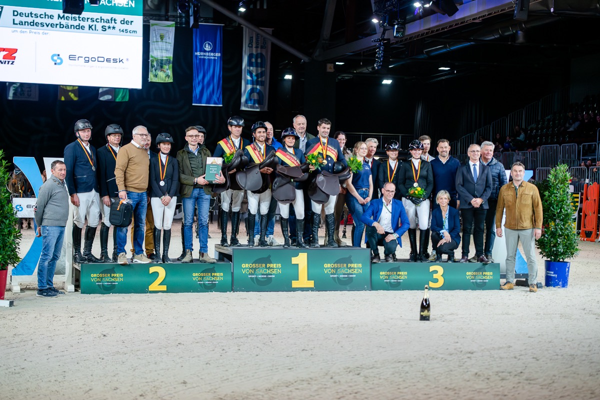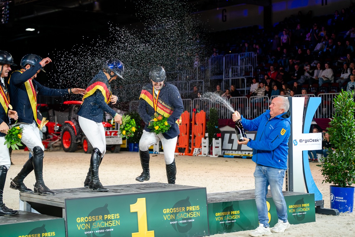 In der Halle herrschte eine tolle Stimmung. Über 2.700 Besucher jubelten mit und feuerten ihren Landesverband an. Ein anspruchsvoller Parcours mit vielen Distanzen forderte die Reiter-Pferd-Paare heraus. Erst Toni Haßmann als vierter Starter lieferte die erste Doppelnullrunde für das Team Westfalen ab. Das Team Rheinland-Pfalz zeigte ebenfalls starke Runden, blieb als einzige Mannschaft mit allen vier Reitern im ersten Umlauf fehlerfrei. Der Sieg war ihnen bis zum vorletzten Starter fast sicher. Spannung herrschte bis zur letzten Minute in diesem Kopf-an-Kopf-Rennen. Als letzte Reiterin hatte es Elisabeth Meyer in der Hand, den Sieg zum dritten Mal nach Baden-Württemberg zu holen. Die Amazone fegte mit Let it Shine in einer superschnellen fehlerfreien Runde durch den Parcours und brachte ihr Team auf den glanzvollen 1. Rang. In Chemnitz ist Elisabeth keine Unbekannte: 2024 siegte sie bereits mit ihrer 9-jährigen Stute im Finale im Großen Preis.
