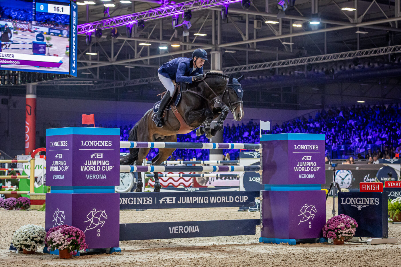 Solche Gefühlsausbrüche sieht man bei ihm auch nicht zu oft: Als Daniel Deusser mit seinem Otello de Guldenboom im Stechen um den World Cup Sieg in Verona über das letzte Hindernis flog und mit einer Bestzeit von 36.13 Sekunden fehlerfrei ins Ziel galoppierte, reckte er stolz und siegessicher seine Faust in den italienischen Abendhimmel. Gerade hatte der 44-Jährige seinen Kollegen Christian Kukuk und Just Be Gentle (v. Tyson) hinter sich gelassen. Die beiden hatten 37.31 Sekunden für den Parcours benötigt. Aber es sollte ja noch einer kommen: Alain Jufer aus der Schweiz als letzter Starter von sieben Paaren im Stechen setzte ebenfalls alles auf eine Karte. Am Ende war er im Sattel von Dante MM (v. Diarado) und einer Zeit von 36.92 Sekunden noch einen Hauch langsamer als Deusser, aber schneller als Kukuk und schob sich auf Platz zwei.