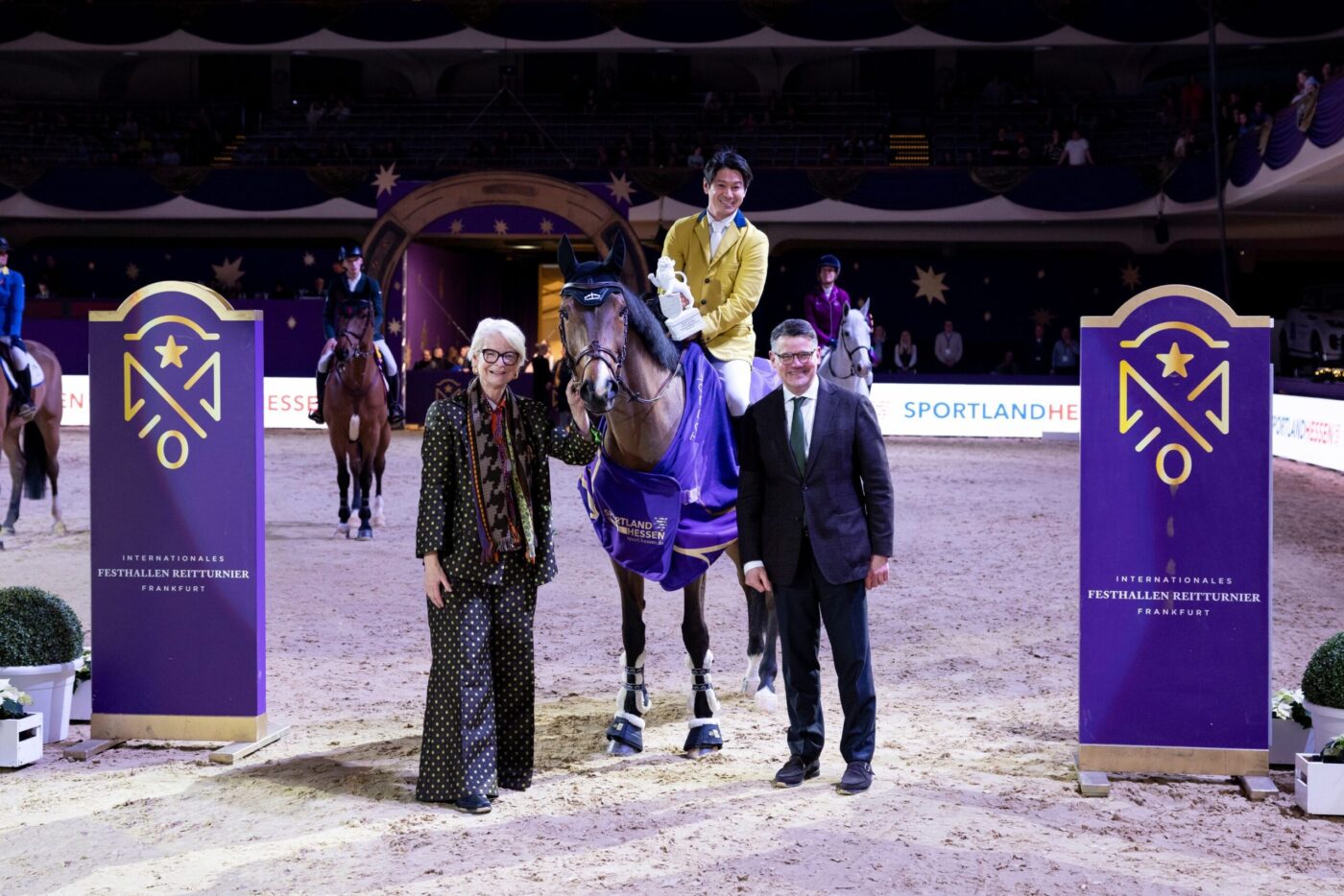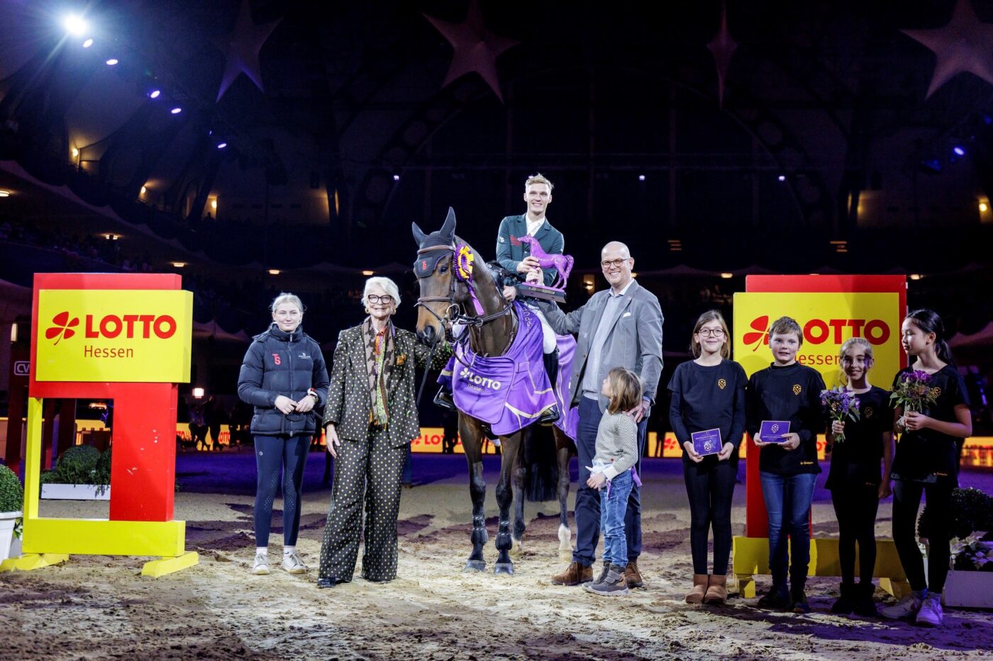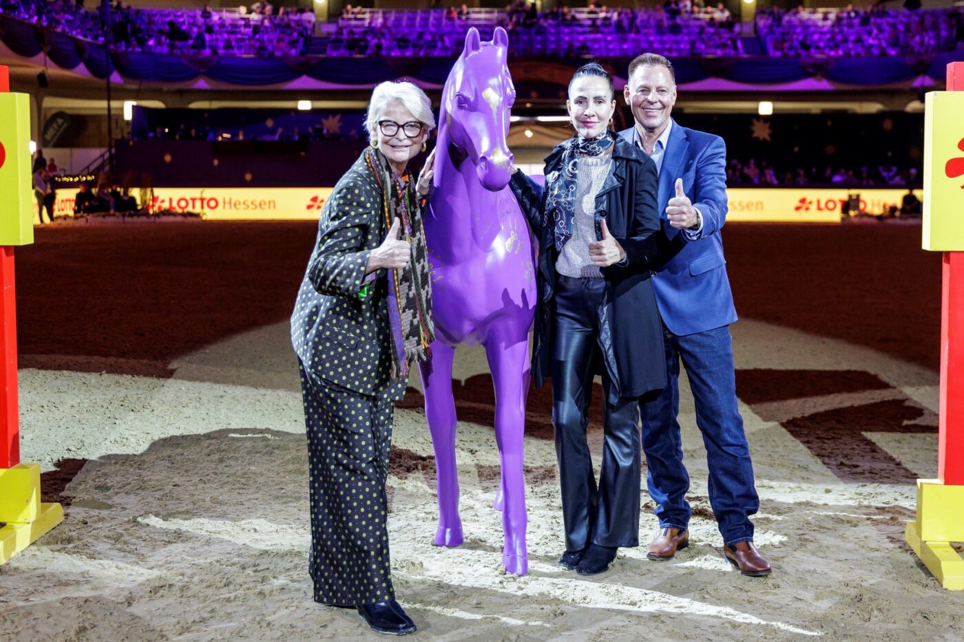Zum neunten Mal war das Lila Pferd Botschafter des Internationalen Festhallen Reitturniers Frankfurt im Einsatz, hat jede Menge goldene Handabdrücke von Siegern und Persönlichkeiten gesammelt und somit seinen Wert über die fünf Festhallentage kontinuierlich gesteigert – bis hin zu 10.000 Euro! Für diese stolze Summe erwarb das Ehepaar Petra Semmler-Schmidt und Jörg Semmler (Dreame.de) das Lila Pferd. Mit diesem Geld werden jedes Jahr regionale Projekte unterstützt, 2025 hat Gastgeberin Ann Kathrin Linsenhoff die „Frankfurter Miteinanderfonds“ und das „Diesterweg-Stipendium“ ausgedacht. Die Charity-Aktion Lila Pferd – Hand in Hand für die Region ist vom Frankfurter Turnier nicht mehr wegzudenken.