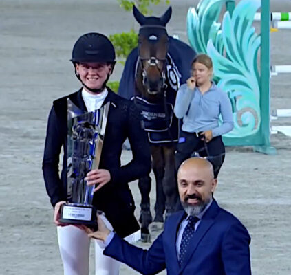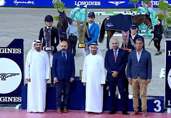 Es war der krönende Abschluss des Wochenendes in Sharjah für Sophie Hinners: Im Stechen des CSI5* Grand Prix über 1,55m, des H.H. Sharjah Ruler Cup, sprang sie mit Iron Dames Kaleni Jo (v. Kannan) auf den zweiten Platz. Nur der für Großbritannien startende Ägypter Abdel Said konnte sich kurz darauf mit Quaker Brimbelles Z (v. Quicksilver St. Simeon) noch an ihr vorbeischieben, weil er eine Abkürzung vor dem Teich in der Parcoursmitte gefunden hatte. Dritter wurde der unverändert für die Ukraine startende René Tebbel auf Paulus-L (v. Corydon van T&L). Das Preisgeld lohnte sich für alle, denn insgesamt ging es um 200.000 Euro.