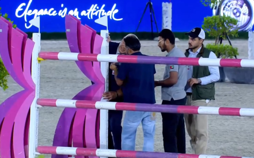 Es war ein Stechen von sieben Reiter-Pferd-Paaren, die den Umlauf fehlerfrei absolviert hatten – es musste aber auf halbem Weg unterbrochen werden und der schon startbereite Abdullah Al Muhairi mit Hudson de Vains (v. Comme il Faut) noch einmal auf den Abreiteplatz zurück: Die Parcours-Mannschaft brauchte doch länger, um mit Hilfe eines Akkuschraubers ein Lädiertes Hinderni zu reparieren.