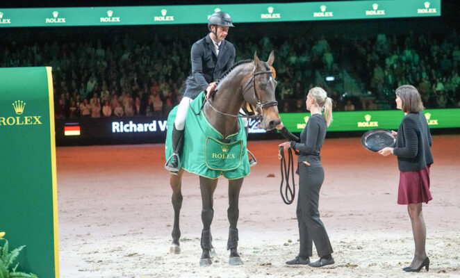 Platz zwei im Rolex Grand Prix mit einer Zeit im Stechen von 40.76 Sekunden ging an Thibeau Spits mit seinem Impress-K van’t Kattenheye Z (v. Indoktro van’t Kattenheye). „Ich habe mir für mein Stechen ganz viel von Richi abgeguckt. Beide Pferde haben einen ähnlichen Galopp“, freute sich der Belgier. Das Podium komplett machten Pieter Devos und seine selbstgezogene Casual DV Z (v. Cornet Obolensky). Platz vier holte Henrik von Eckermann mit seiner auf diesem Niveau noch unerfahrenen Emerald-Tochter Qasirah van de Reistenhoek vor Martin Fuchs und L&L Lorde (v. Clyde).